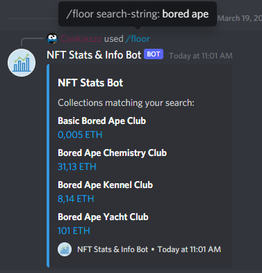 The /floorsearch text command searched for all known collection floors for the provided name or slug. You can enter part of the collection name or slug. The bot will attempt to find them all. You can search by collection name so you don't have to know the collection slug!